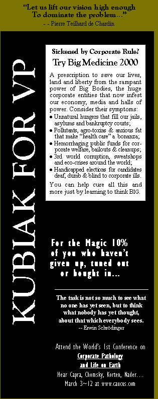 What to do? It is no doubt impossible to de-mob the primary schedule very soon, but NH might be better served (and avenged) if its libertarian ideals were mobilized for a final assault on Big Body dominion. The US has been rightfully leery of Big Corporate Power for a century, especially in the home of Live-Free-or-Die. Today as corporate powers swell and converge, darkening the sky and our hopes for individual rights and popular rule, the 2000 election offers one last rare chance to challenge their supremacy and control. Voting for the Kubiak would make the point, but you might also vote boldly (and actually) for yourselves. Let this write-in signify that We the People still take our sovereign role in this democratic passion play seriously, and therefore demand the expulsion of Big Bodies (and their coin-operated candidates) from our halls of governance for once and for all. After all, what possible legal, moral or rational justification is there for giving vast artificial, autocratic and profit-obsessed bodies any political role whatever in a democratic society, let alone predominant power? In the short term, this means we must strip corporations of their political and "human" rights as "legal persons," and thus their dominant power over our leaders, institutions and political processes. (Big Bodies can spend unlimited amounts on lobbying, donations & political advertising because a benighted court once ruled that sluicing money is how corporate persons express themselves, and any limit upon this torrent would violate their "Freedom of Speech." Strange logic, sick humor, but alas now legally true.) |